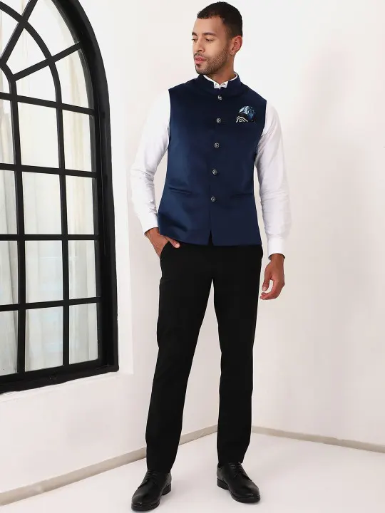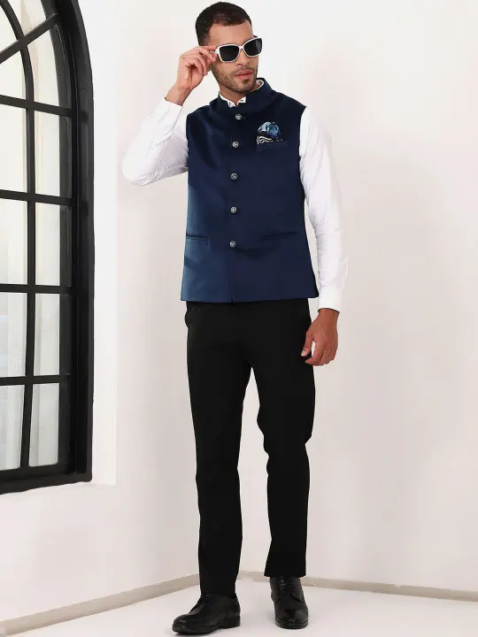 Blue solid woven Nehru jacket, has a mandarin collar, a full button placket, sleeveless, three pockets