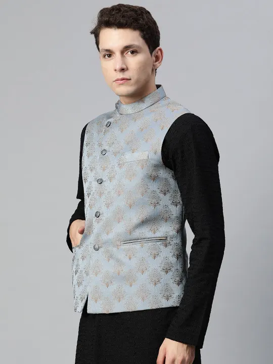 Woven design Nehru jacket, has a mandarin collar, a full button placket, sleeveless, and three pockets