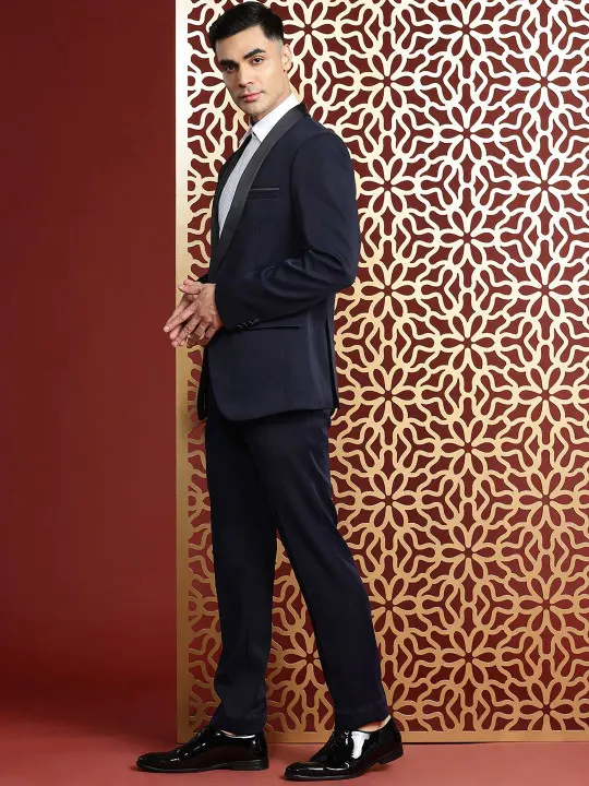 Navy blue Solid slim-fit tuxedo blazer, has a shawl collar, long sleeves double vent with 3 pockets & straight hem